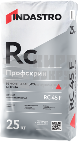 Ремонтный состав Профскрин RC45 F– готовая к применению сухая смесь, изготовленная на основе портландцемента, фракционированного песка, полимерной фибры и модифицирующих добавок. После затворения водой образуется тиксотропный раствор. Продукция экологически безопасна и не содержит вредных примесей, оказывающих отрицательное воздействие на здоровье человека. Соответствует действующим на территории Российской Федерации санитарно-гигиеническим нормам. Для внутренних и наружных работ. Продукт изготовлен в соответствии с ТУ производителя из экологически чистого сырья. Преимущества: - Для проведения работ в зимний период - Соответствует классу R4 - Безусадочный - Быстрый набор прочности - Слой нанесения до 50 мм - Внутреннее армирование минимизирует тенденцию к образованию трещин - Высокая износостойкость - Высокая водонепроницаемость